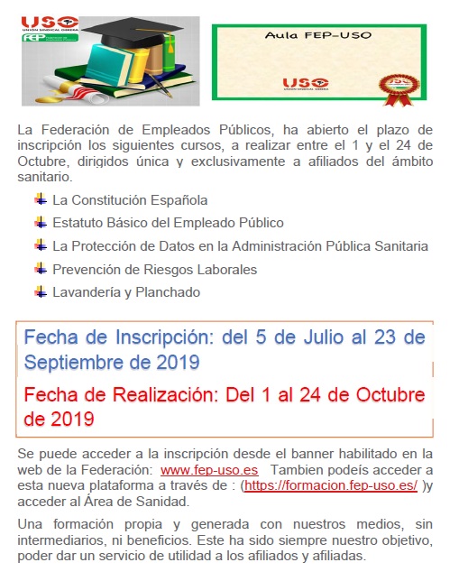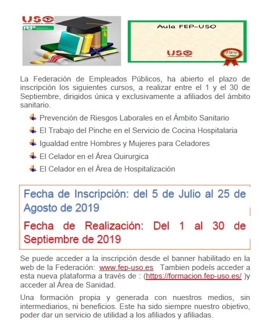 La Federación de Empleados Públicos de USO, a través de su Aula Formativa FAC-USO imparte de forma GRATUITA a los afiliados, los cursos indicados en la Web de Formación.