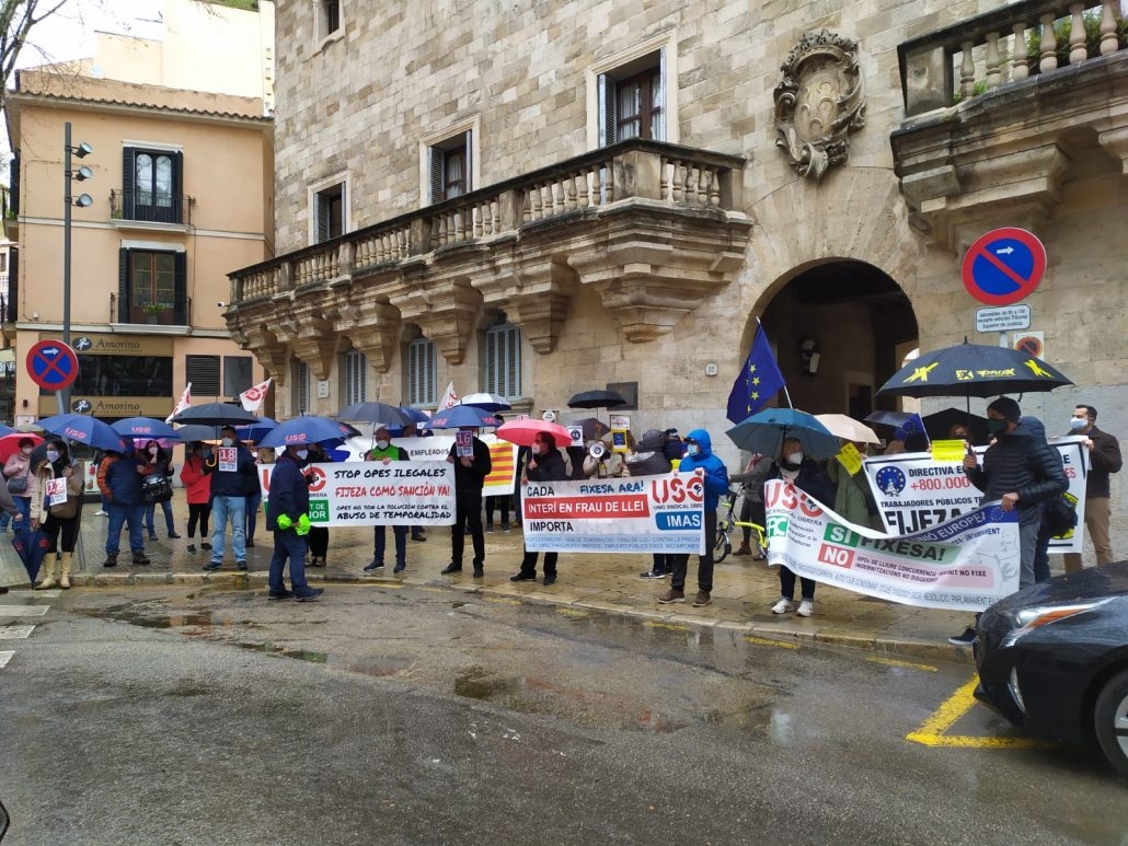 En una mañana pasada por agua, los trabajadores y trabajadoras se han concretando frente a la sede del Tribunal Superior de Justicia, en Palma, para exigir a la Administración el cumplimiento de la sentencia del TJUE de hace un año, que declaró ilegal la situación de abuso de temporalidad que sufren más de 800.000 empleados públicos de nuestro país. El acto ha tenido lugar también en Ibiza y en otras muchas ciudades españolas.