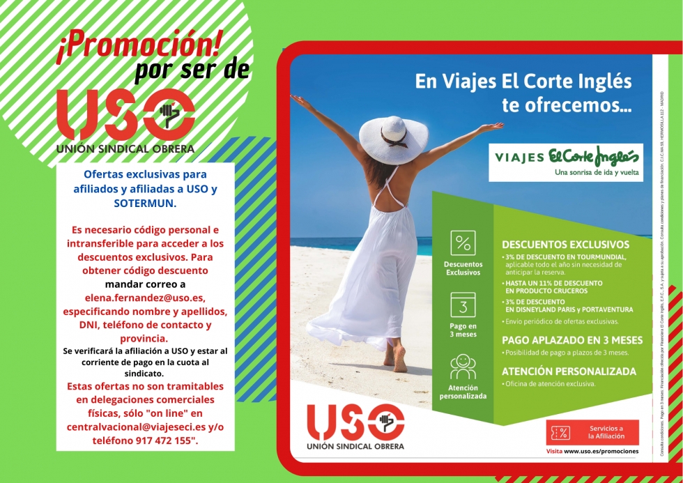 Deseamos que os resulte de utilidad este nuevo convenio firmado con Viajes El Corte Inglés y los descuentos que se aplican a la afiliación USO.
